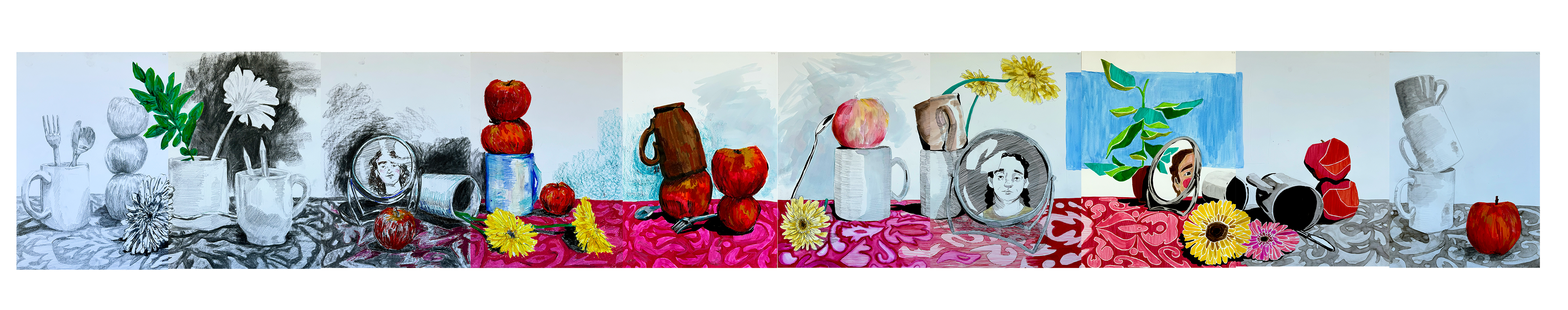Other works of mine in Life Drawing involved two panels of mix media on paper. The first one is a series of still life drawings while the second one portrays the ordinary journey from home to university.