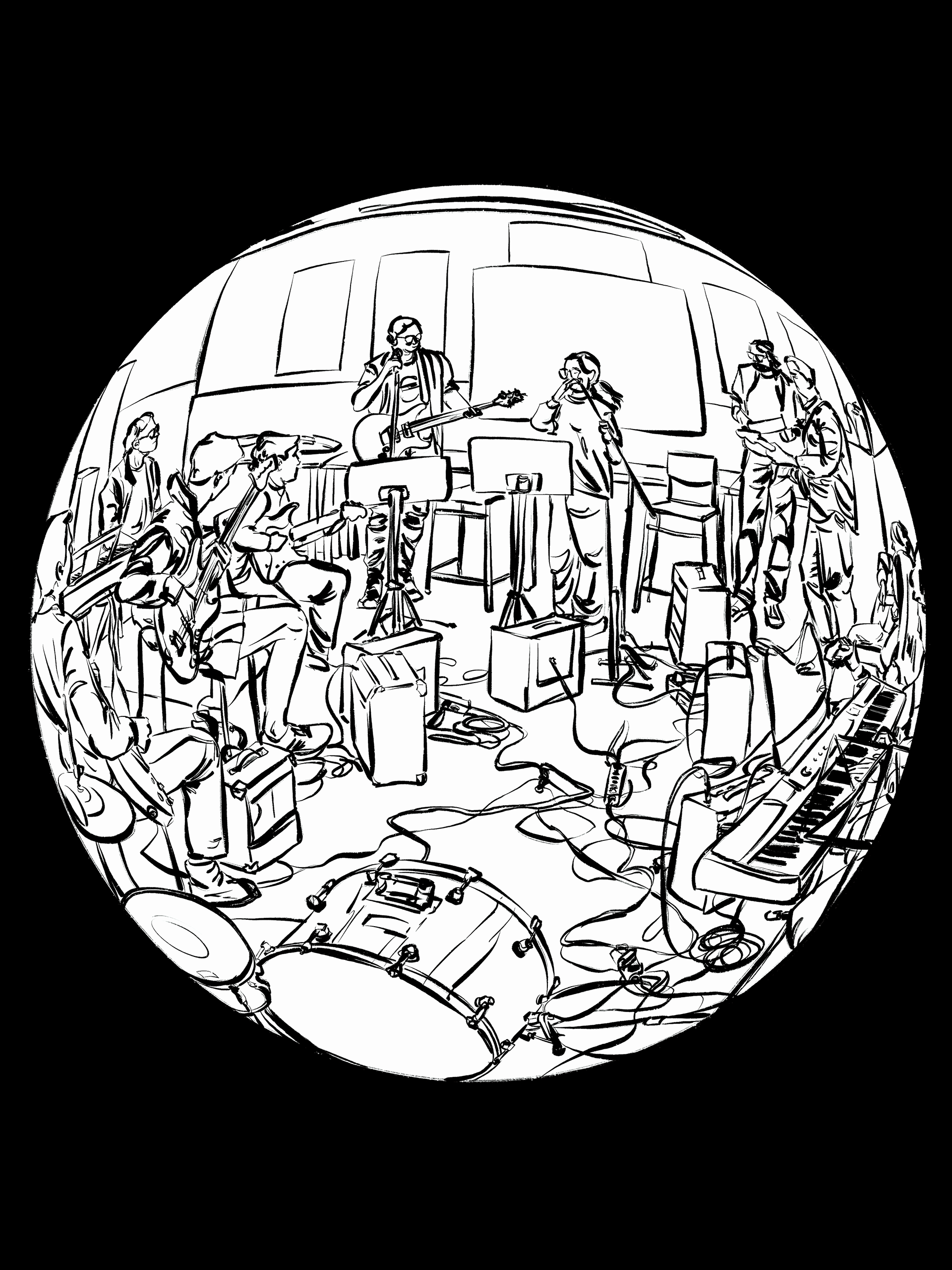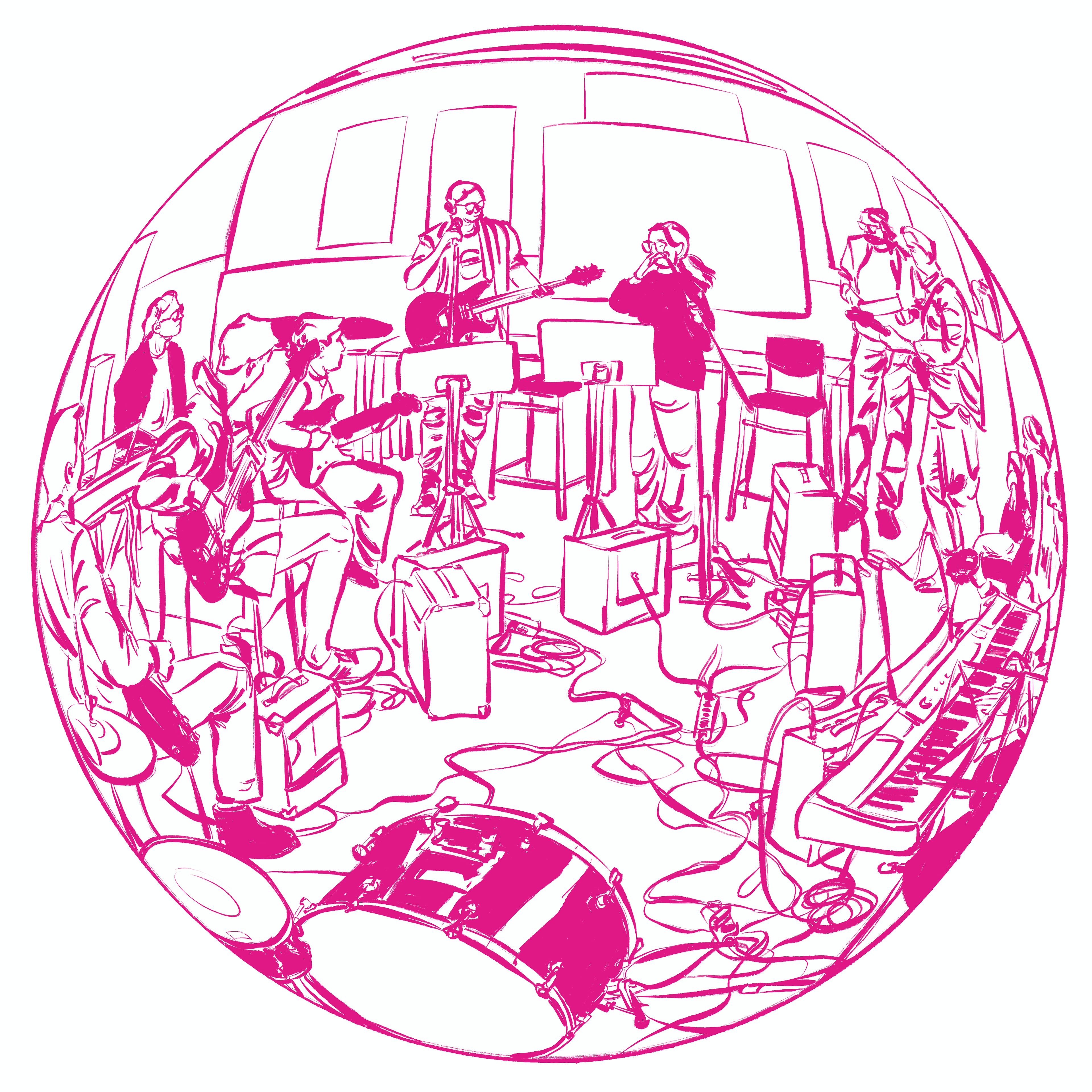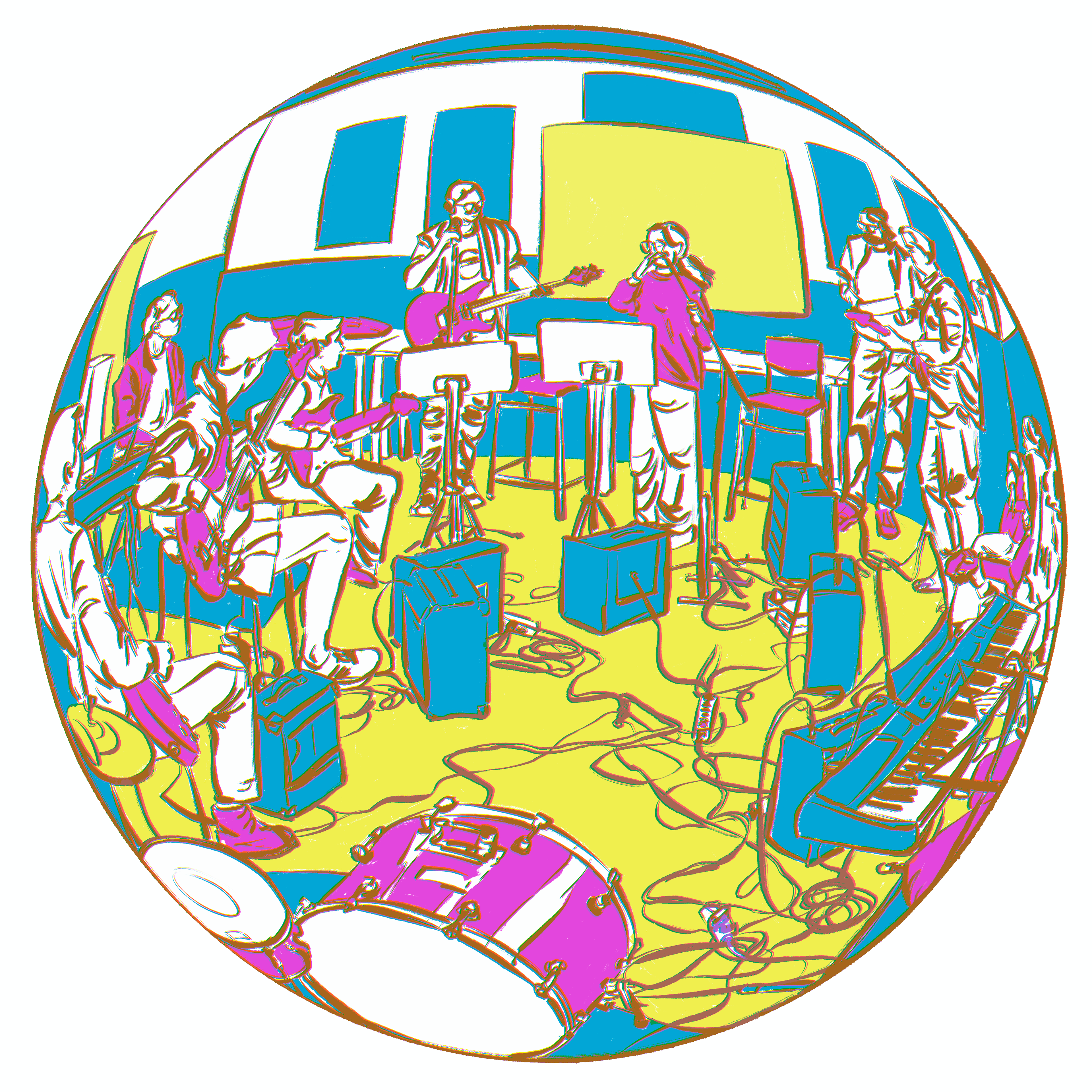 I took a drawing I had in my sketchbook from a Jam Session at Academia de Rock in Lisbon, put it into Photoshop to play around with CMYK layering and try to give the illustration a "fish-eye" effect. I also used Procreate for some final details.
