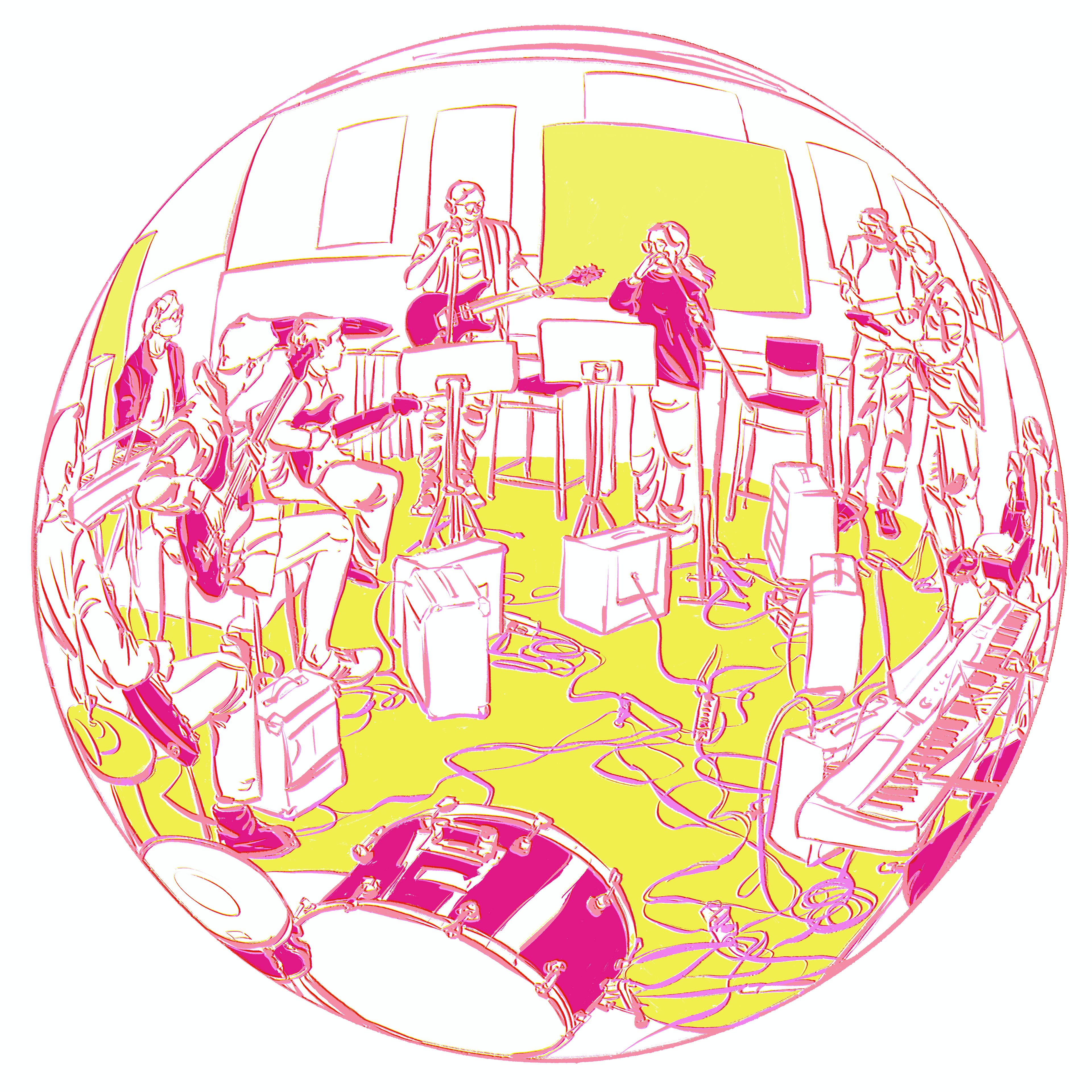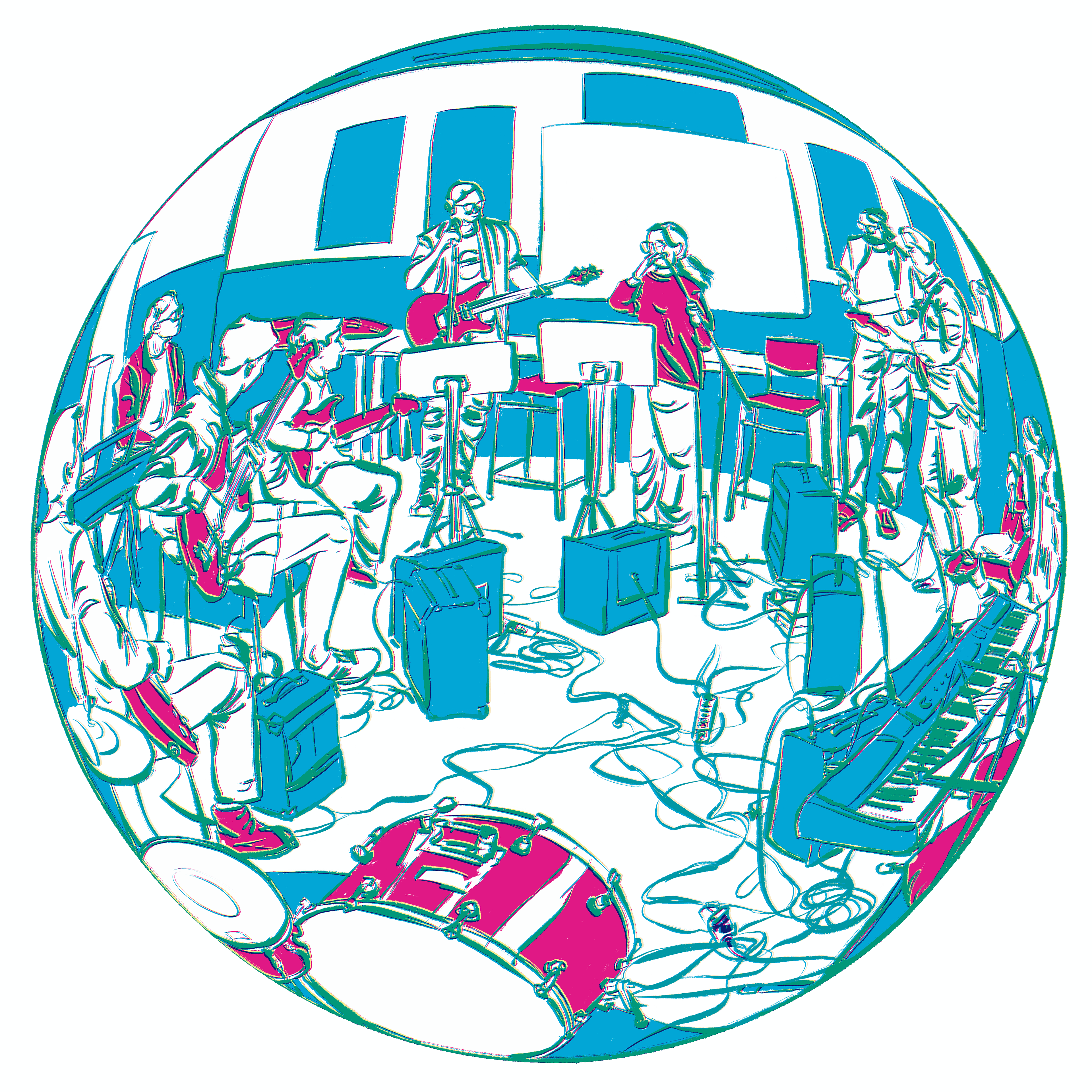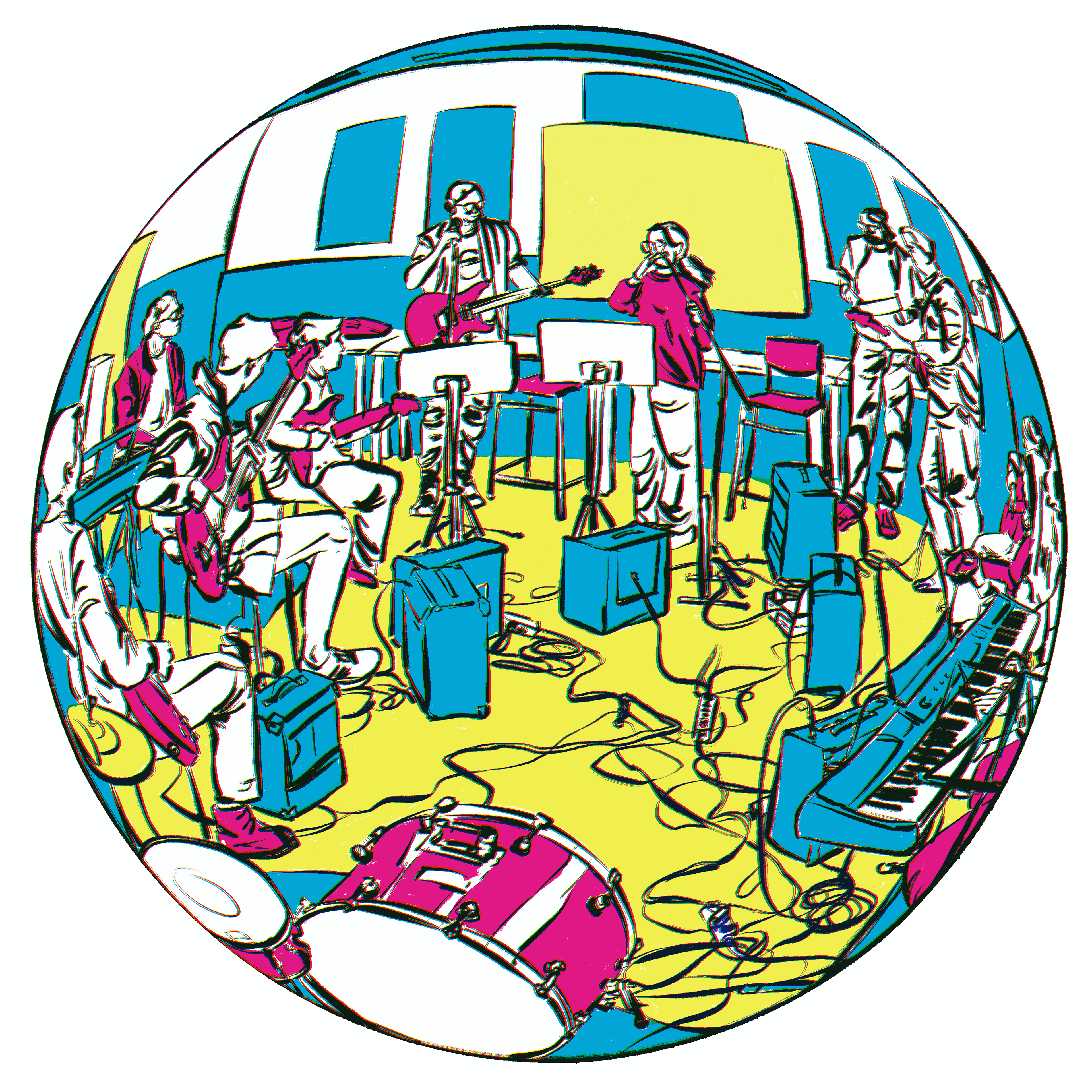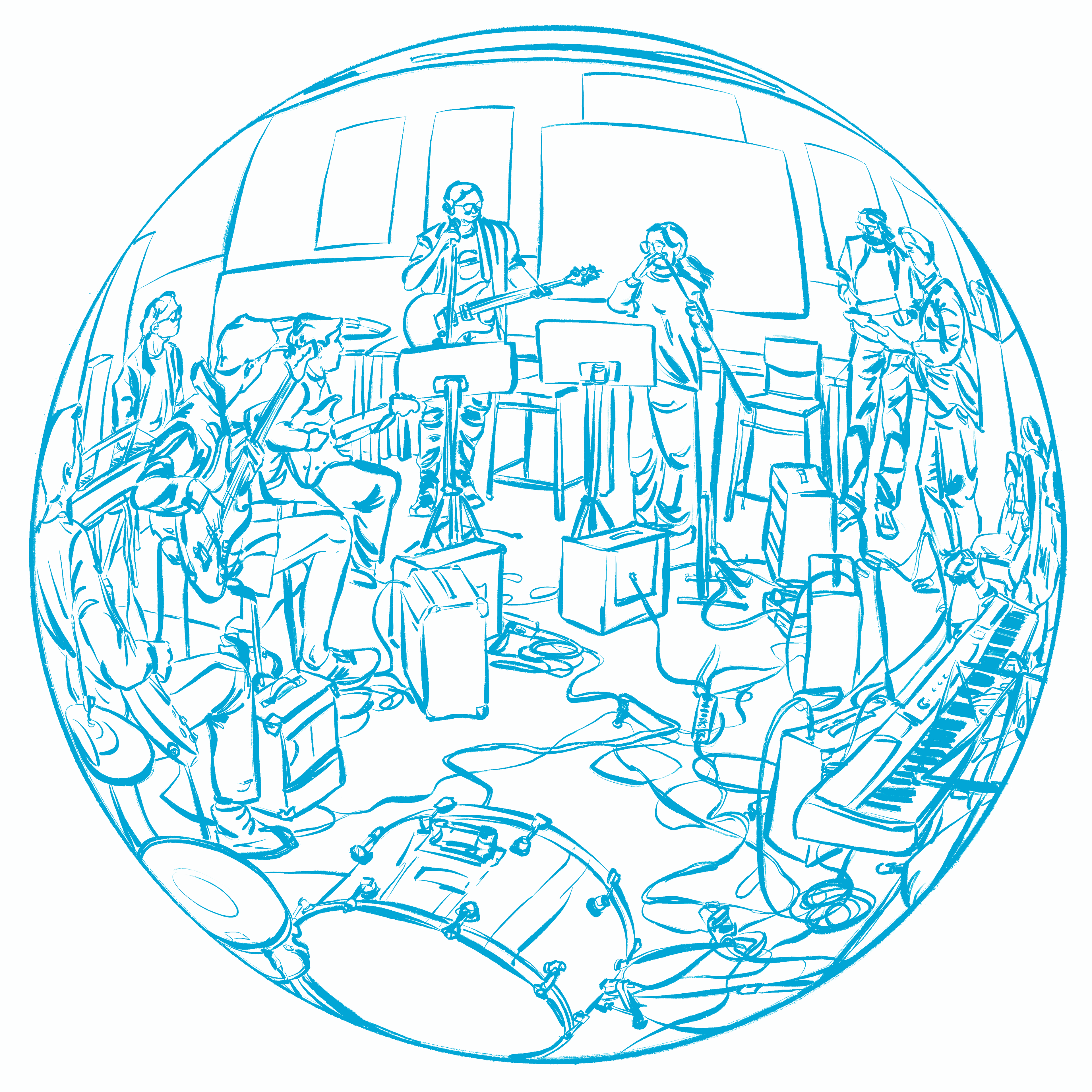 I took a drawing I had in my sketchbook from a Jam Session at Academia de Rock in Lisbon, put it into Photoshop to play around with CMYK layering and try to give the illustration a "fish-eye" effect. I also used Procreate for some final details.