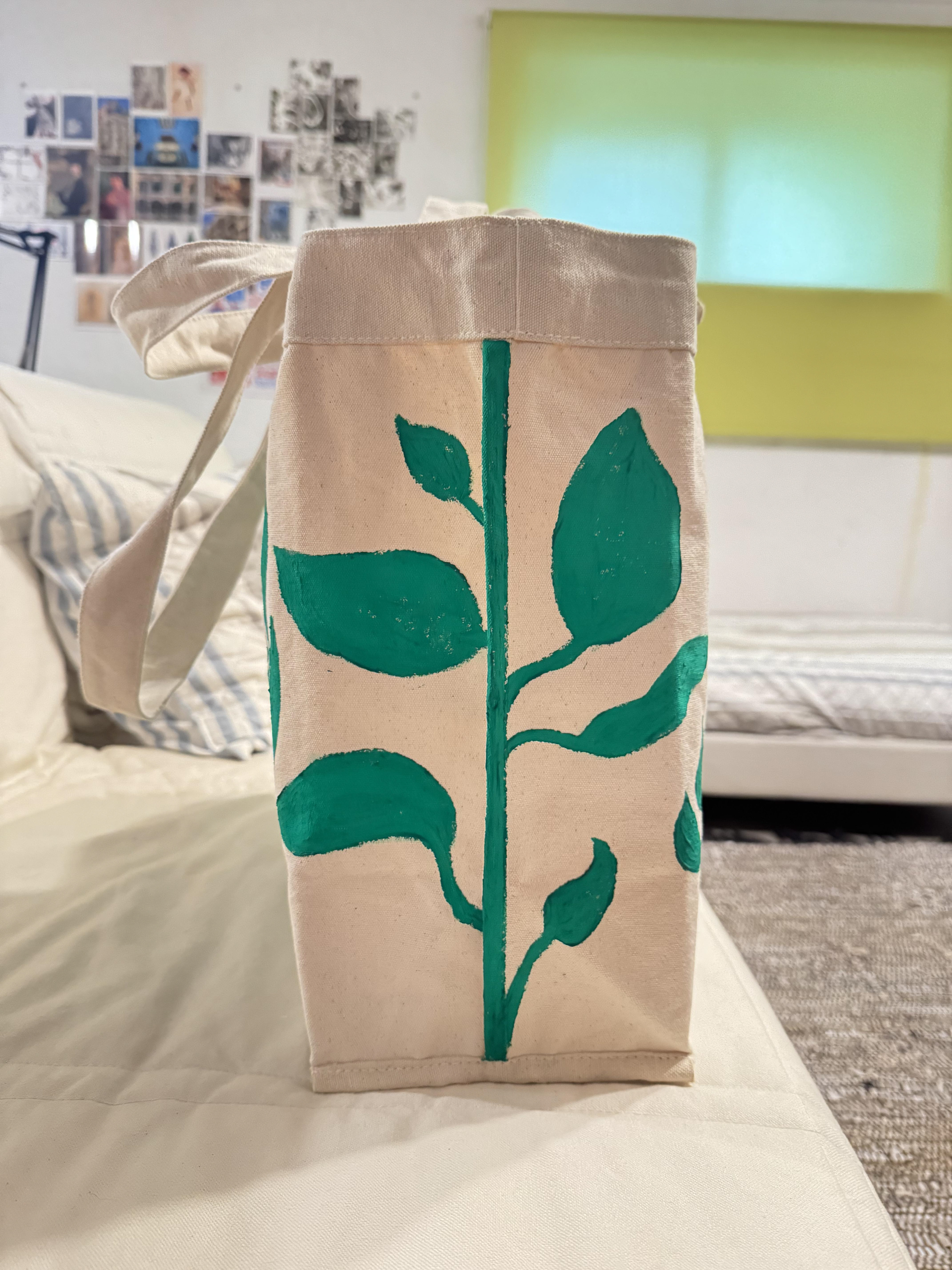 This tote bag was made using a stencil technique and green fabric paint. It was my first time working with both stencil and fabric.