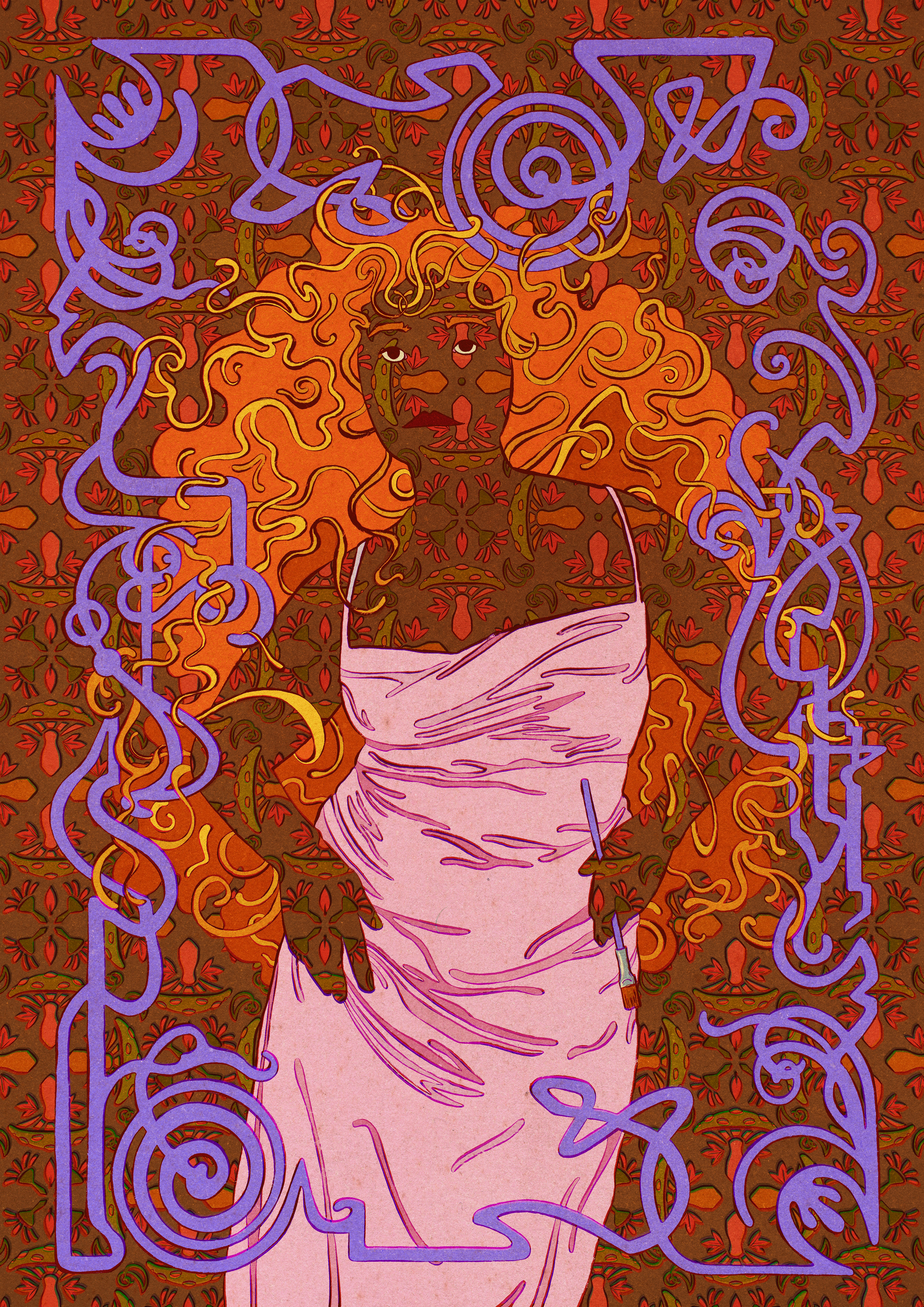 Made for a contest, in this three illustrations I wanted to play around with patterns and hair, mostly inspired by Alphonse Mucha's Art Nouveau drawings. The intricate details, textures and slight chromatic aberration effects in this digital works are some of my favourite of what I have done until now.