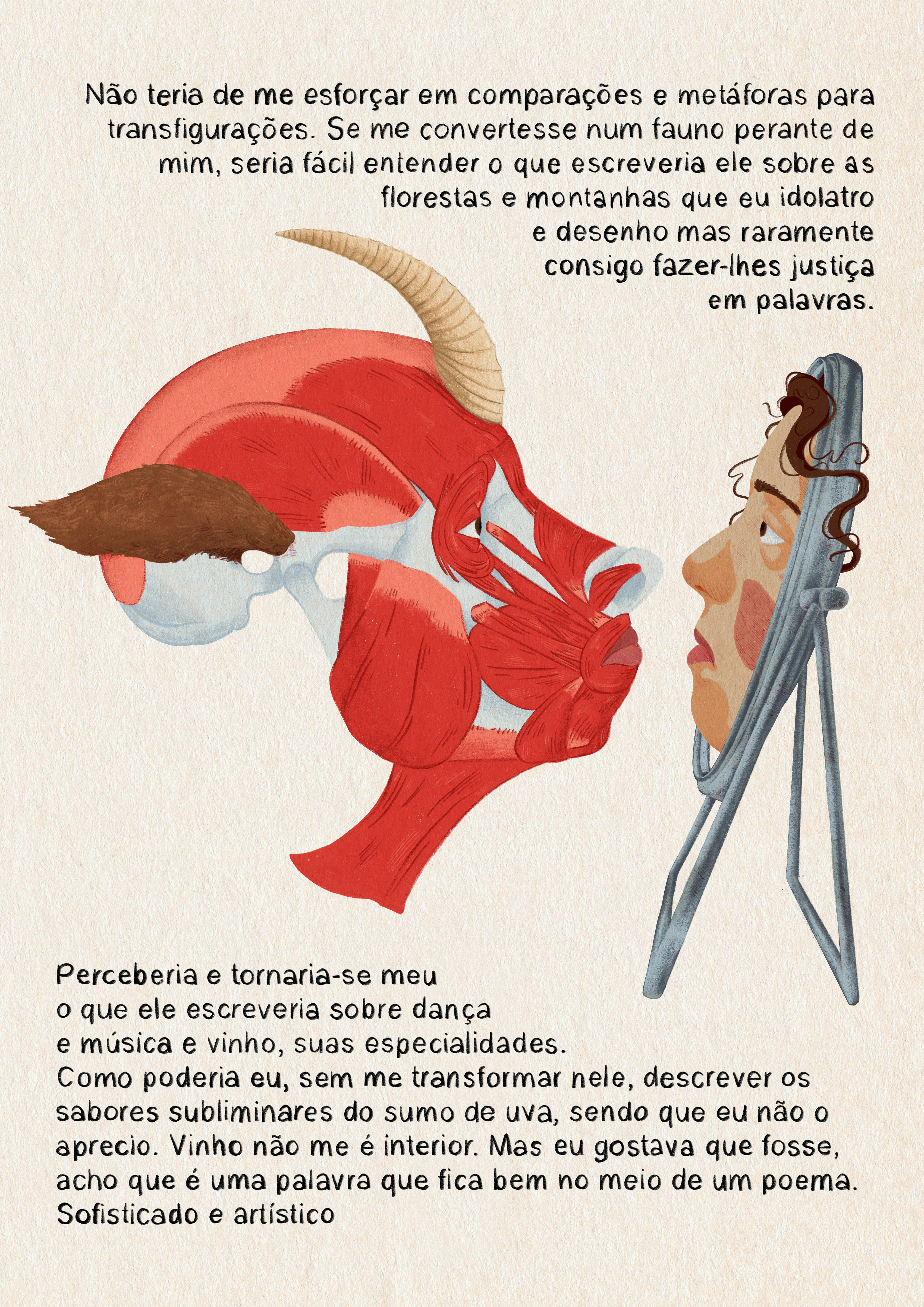 I chose to present a small comic/ illustration book that portrayed the different units that were approached in class: osteology, myology, mimic muscles and comparative anatomy. We were required to do a bit of research for this project and, out of these subjects I decided to delve deeper into comparative anatomy. After some sketches (to be seen below), I drew myself as a fawn, since what interested me most in comparative anatomy was a class we took on hybrid beings, specifically mythological ones.
